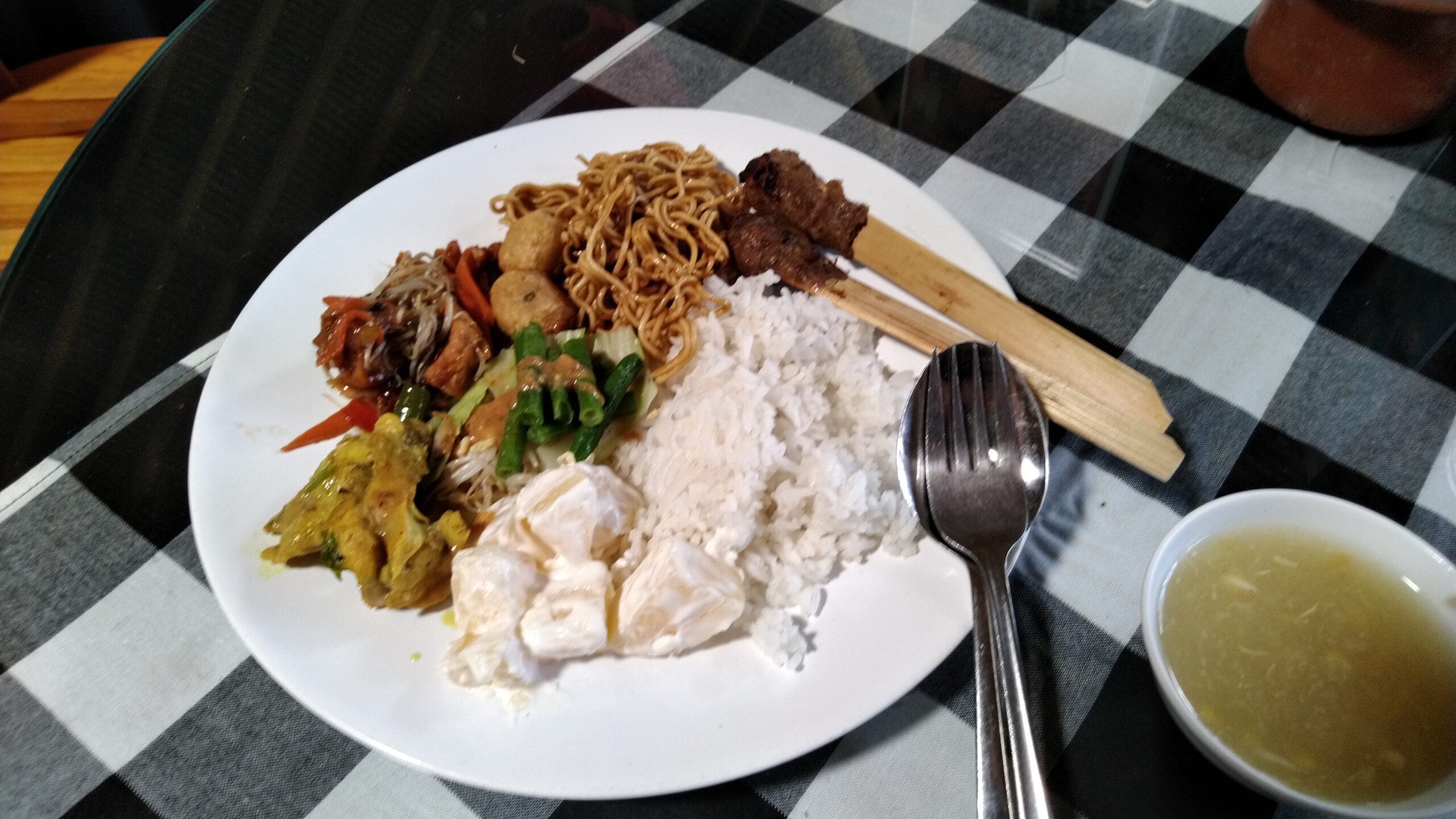 ごはん、ポテトサラダ、野菜炒め、卵焼き、コロッケ、焼きそば、サテ(鶏のつくね串焼き)、それと中華風のスープでした。